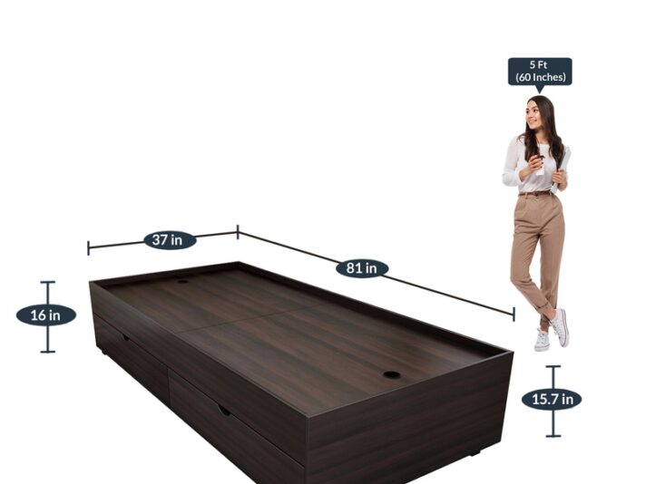Brand Mintwud Dimensions(In Inches) H 36.2 X W 63.2 X D 86 Mattress size :78 L x 60 W Inch (Mattress Not Included) Weight 102 KG Colour Wenge Warranty 24 Months' Warranty Assembly Carpenter Assembly Primary Material Engineered Wood Room Type Bedroom Storage Drawer Storage Seating Height 12 Inches Recommended Mattress Size 78 L x 60 W Inch Product Rating 4.5 Dimensions (In Centimeters) H 91.94 x W 160.52 x D 218.44₹23,549.00 -