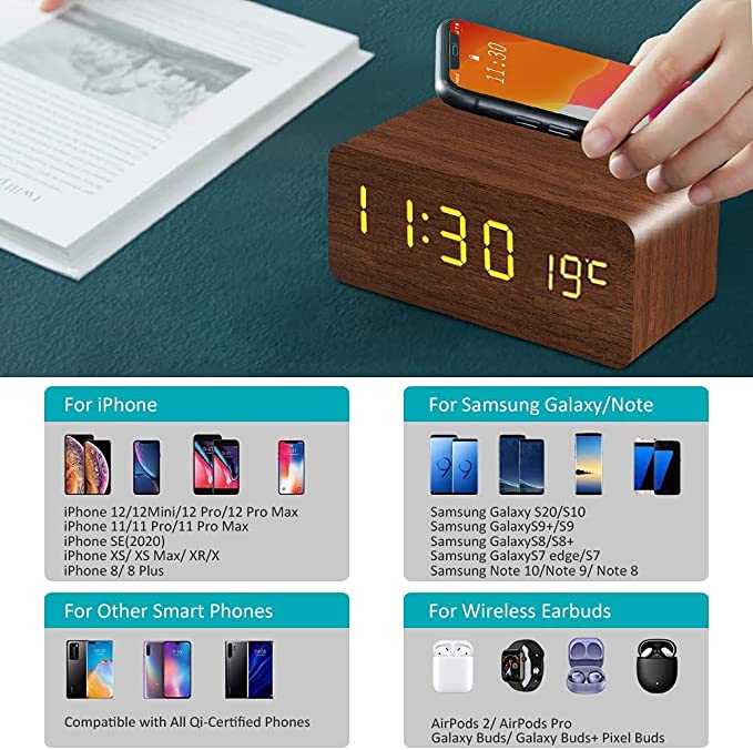 Bluebell Wooden Digital Smart Alarm Clock with Wireless Charging, 3 Alarms, LED Display, Temperature, Sound Control and Snooze, Digital Table Clock for Home, Office, Desk, Students(Brown)