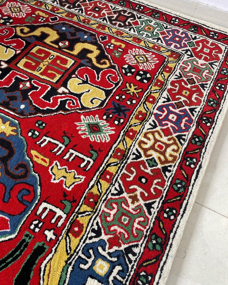A true masterpiece.nnDimensions: 7*4.5 Feetn? Material: 100% New Zealand Wooln? Quality: 4000 GSMn? Hand Tuftedn? Style: Cut-Pilen? Highly Skilled Craftmanship